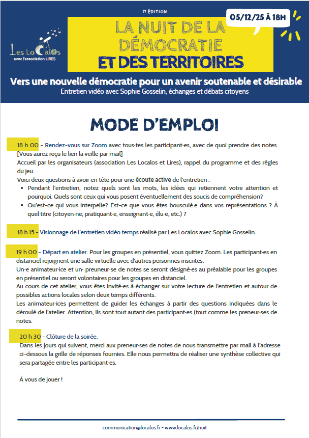 La septième édition de la Nuit de la démocratie et des territoires, organisée par les Localos et l’association LIRES, aura pour thème « Vers une nouvelle démocratie pour un avenir soutenable et désirable. Comment tisser de nouvelles alliances entre humains et non humains ? »