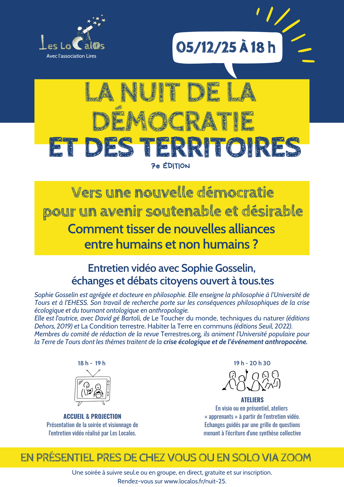 La septième édition de la Nuit de la démocratie et des territoires, organisée par les Localos et l’association LIRES, aura pour thème « Vers une nouvelle démocratie pour un avenir soutenable et désirable. Comment tisser de nouvelles alliances entre humains et non humains ? »